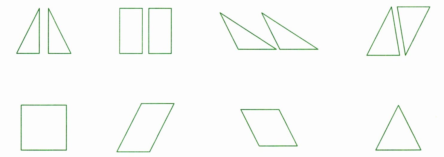 【解析】:观察上面的图形,第一组两个直角三角形可以拼成下面的三角形;第二组两个长方形可以拼成下面的正方形;第三组两个三角形可以拼成下面的平行四边形(第二个平行四边形);第四组两个三角形可以拼成下面的平行四边形(第一个平行四边形)。