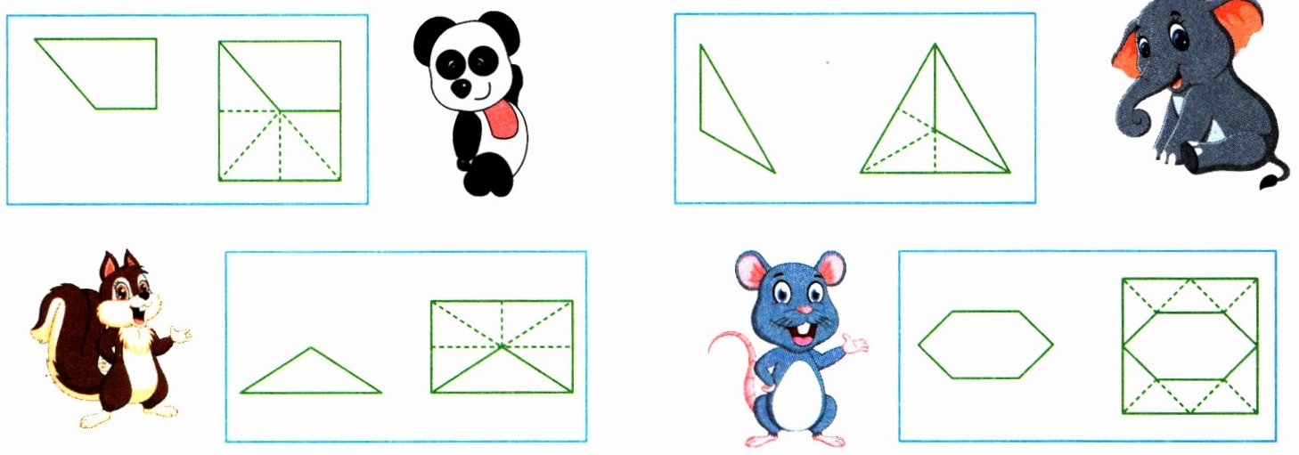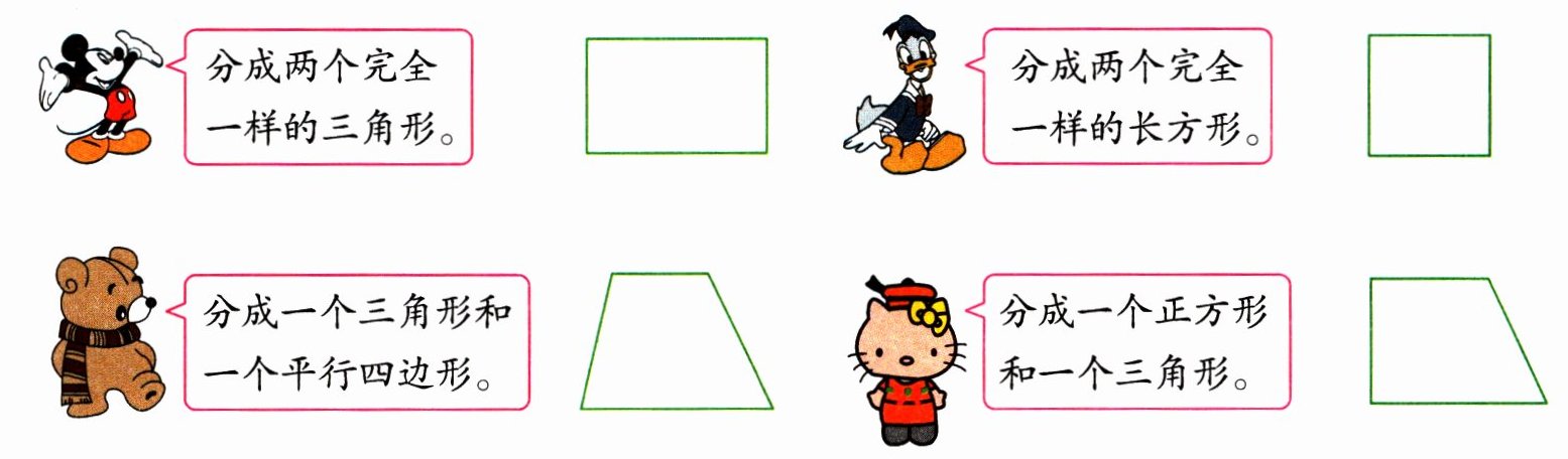 【答案】:熊猫对应的右边图案(第一个框内右边图案)、大象对应的右边图案(第二个框内右边图案)、松鼠对应的右边图案(第三个框内右边图案)、老鼠对应的右边图案(第四个框内右边图案)分别与左边图案相同,将这些相同图案涂一涂。