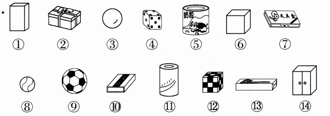 1. 长方体:①②⑦⑩⑬⑭ 正方体:④⑥⑫ 圆柱:⑤⑪ 球:③⑧⑨