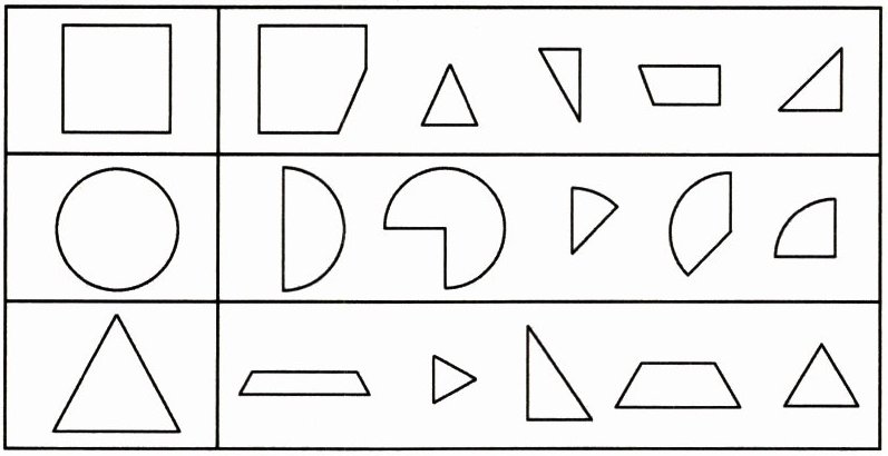 【解析】:观察左边图形和右边图形的形状特征,第一行左边是正方形,右边第一个图形(五边形不符合),第二个小三角形和第四个梯形无法拼成,第三个细长三角形和第五个直角三角形可以通过拼接组成正方形(将它们的斜边重合等方式);第二行左边是圆形,右边第一个半圆和第三个小扇形(将半圆和小扇形的直边重合等方式)可以拼成圆形;第三行左边是大三角形,右边第二个小三角形和第五个三角形(将它们对应边重合等方式)可以拼成大三角形。