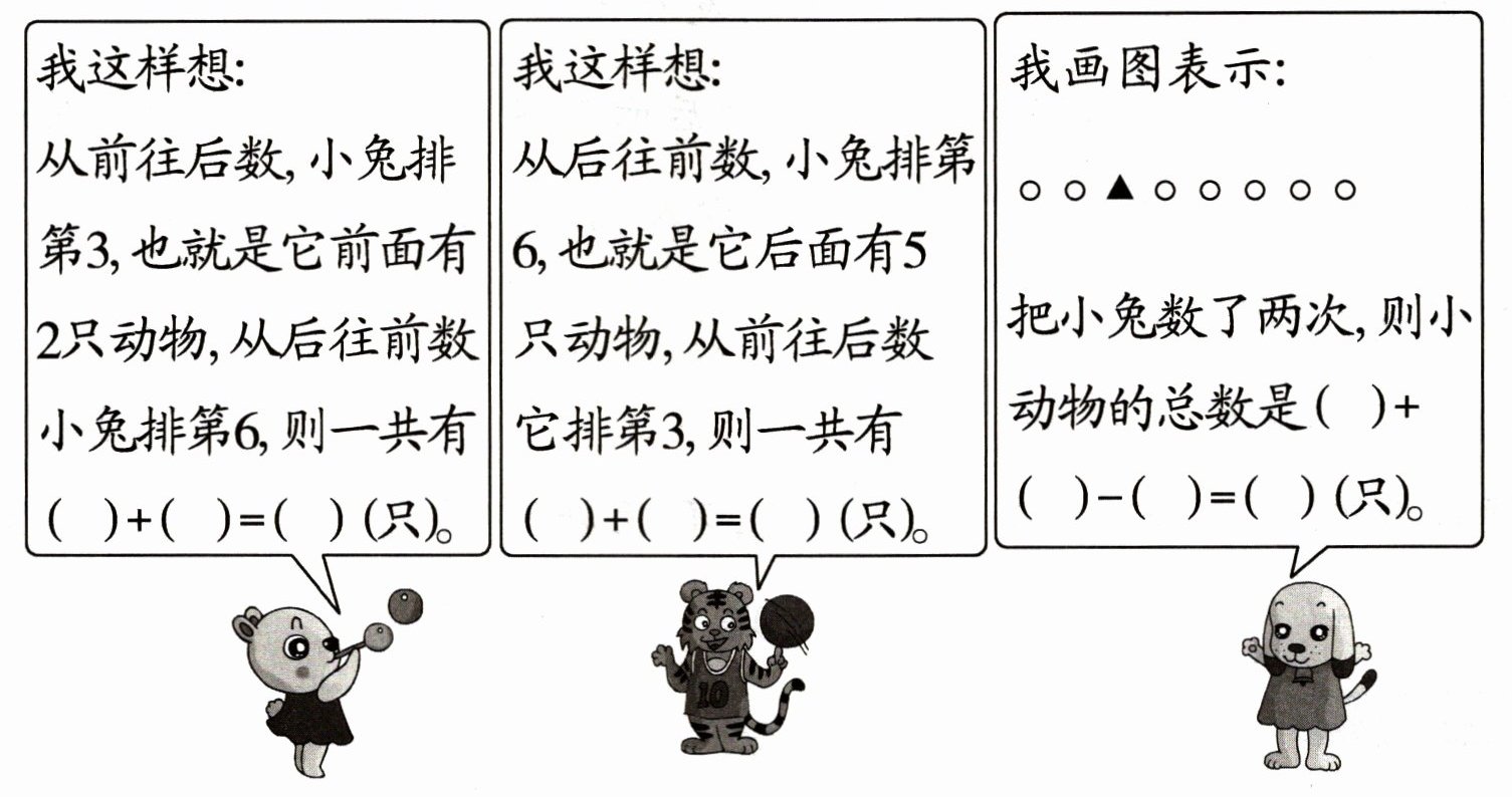 例1 小动物们排成一队去森林公园,从前往后数小兔排第3,从后往前数小兔排第6。一共有多少只小动物去公园?