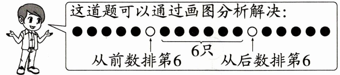 例3 一群大雁排成一行往前飞,其中有两只受伤了,从前数第一只受伤的大雁排第6,从后数另一只受伤的大雁也排第6,两只受伤的大雁中间还有6只大雁,这群大雁共有多少只?