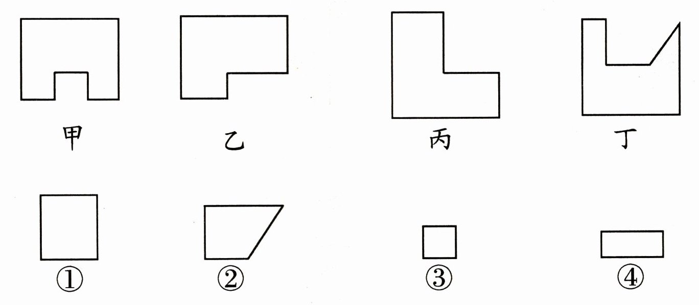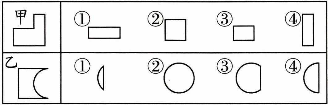 分析 拼组图形时,首先要仔细观察,看清一个整体图形中所缺少的部分是什么样的图形,再拼组。甲图缺少一个长方形。乙图缺少一个半圆。