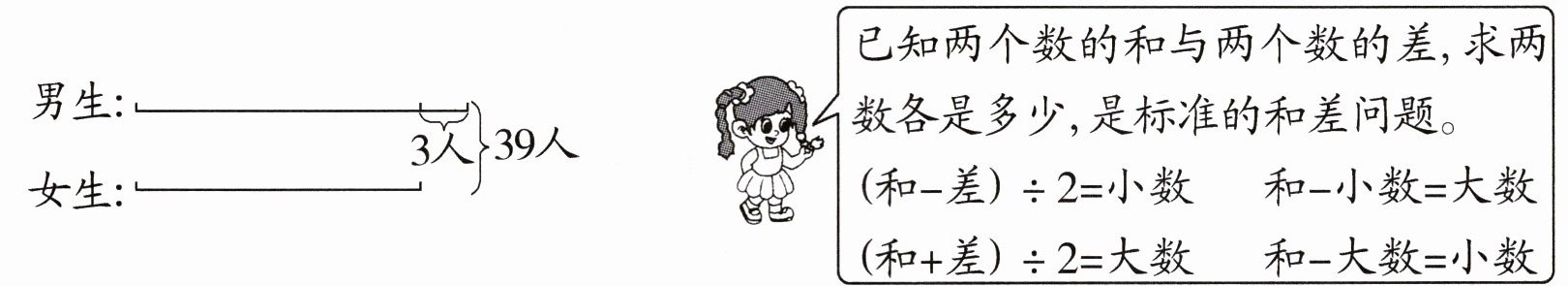 例1 电子琴兴趣小组有学生39人,男生比女生多3人,该兴趣小组男、女生各有多少人?
