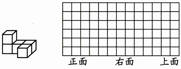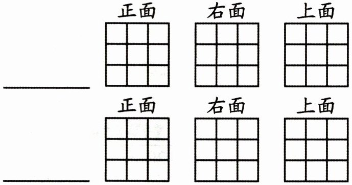 3. 淘气用4个正方体搭立体图形,从上面看是2个正方形。请你试着用两种方法搭出来,并分别画出它们从正面、右面和上面看到的图形。