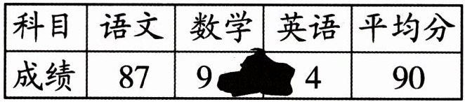 数学成绩:通过计算$ 90 × 3 - 87 - 94 = 89 $ (分) ,再根据污损情况可知数学成绩为