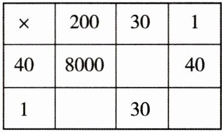 故表格中$30×40$处填$1200$,$200×1$处填$200$,$1×1$处填$1$;乘法算式$231×41=(9240)+(231)=(9471)$。