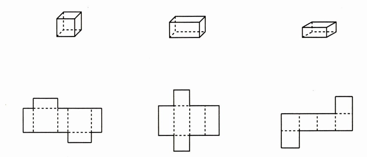 第三个立体图形是长方体(有两个相对面是正方形),其展开图是第二行第三个展开图。