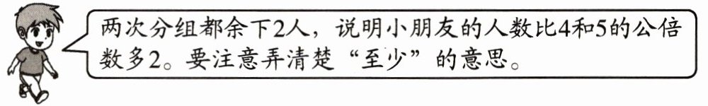 例1 一些小朋友分组做游戏,第一次分组每组4人余下2人,第二次分组每组5人也余下2人。你知道至少有多少个小朋友做游戏吗?