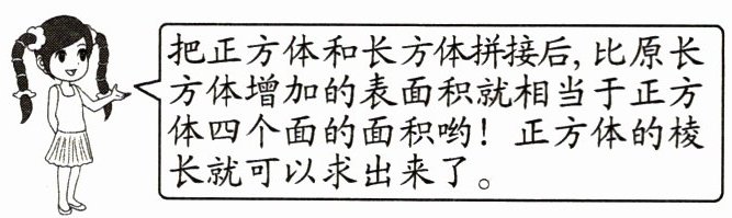 例2 如图,用一个正方体和一个长方体拼成一个新的长方体,拼成的长方体的表面积比原来的长方体的表面积增加了$36cm^{2}$。已知原长方体的长为9 cm,你知道现在拼成的新的长方体体积是多少吗?