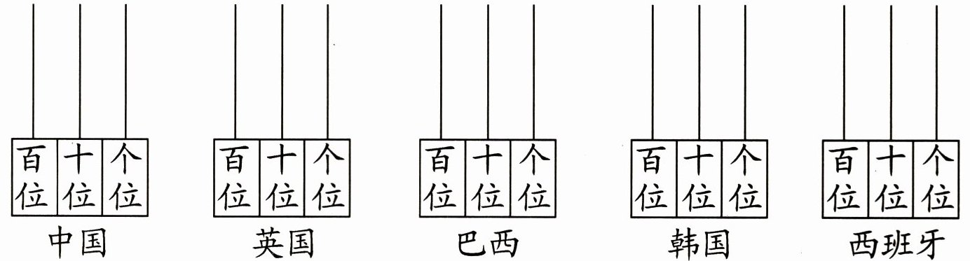 (2)请你动手试着在下面的计数器上表示各国的奖牌数。