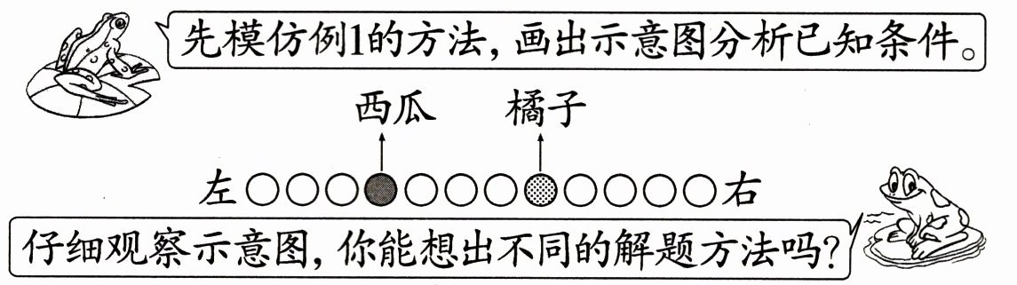 例2 许多筐水果排成一排等待出售。从左往右数,西瓜是第4筐;从右往左数,橘子是第5筐。在西瓜和橘子中间还有3筐水果。这排水果共有多少筐?