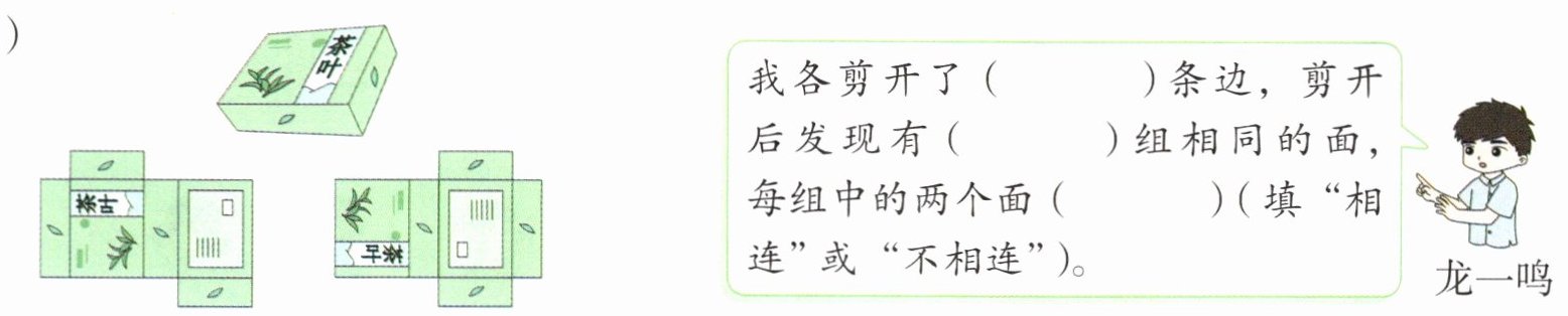 我各剪开了( )条边,剪开后发现有( )组相同的面,每组中的两个面( )(填“相连”或“不相连”)。