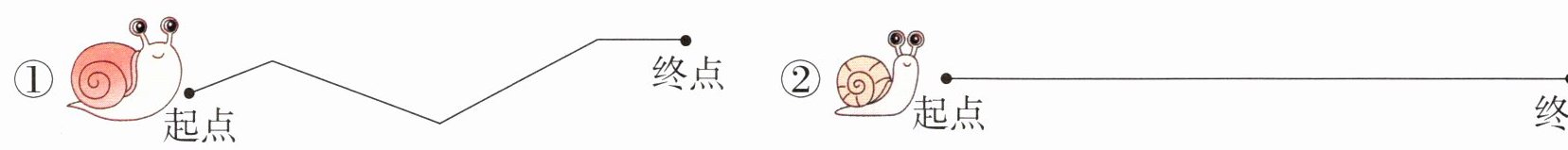 4.② 解析:用圆规比较哪只蜗牛爬行的路线比较长,首先明确两条路线的起点和终点,将圆规的针尖固定在①号蜗牛爬行路线的一端,从起点开始,用圆规沿着路线依次截取,每截取一段,就在②号蜗牛爬行路线上从起点开始截取同样的长度,截取4次后,发现②号蜗牛爬行的路线还有剩余,所以蜗牛②爬行的路线比较长。