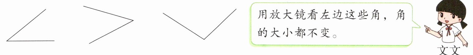 文文说得对。因为用放大镜看左边这些角,只是线变粗变长了,两边张开的大小不会变,所以角的大小不变。解析:解答此类题目需明白,角的大小只与两边张开的大小有关,与两边的长短、粗细没有关系。