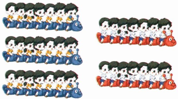 1. 参加运球接力赛的人数可以用算式$5 × 4$表示,请你在下图中画出可能的分组方式。(“$○$”表示一人)