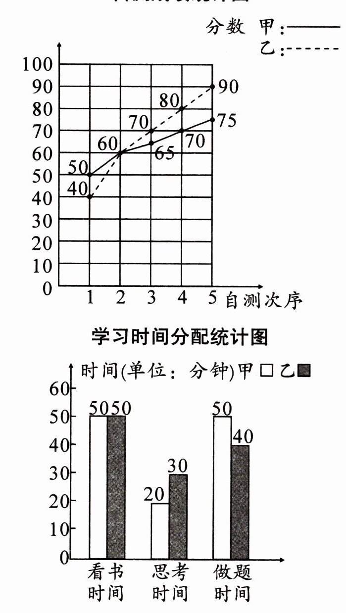 3. 下面两个统计图,反映的是我校六年级甲、乙两位同学在复习阶段自测成绩和在家学习时间分配情况,请看图回答以下问题: