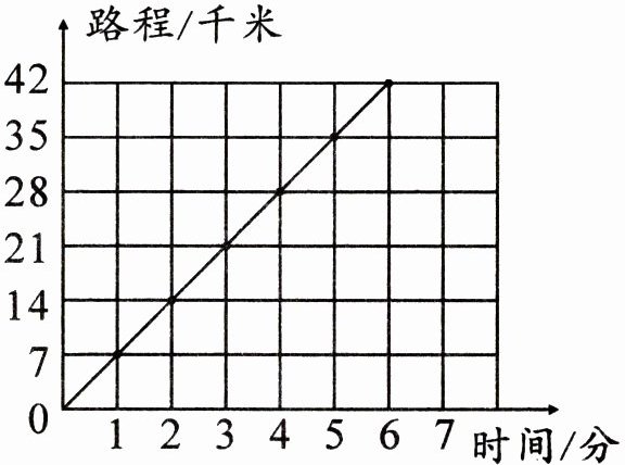 【解析】:根据提供的各组数据描出图像的许多个点,再依次连成直线。路程和时间相对应的数的比值都是$7$,即速度一定,路程和时间成正比例,图像是一条直线。对照图像,可以根据时间的值估计出路程的值,也可以根据路程的值估计出时间的值,估计时允许有一定的出入。