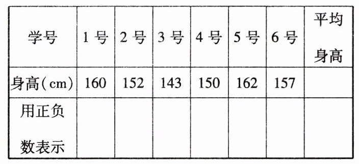 2. 下面是六(1)班6名女同学的身高。以她们的平均身高为标准,把平均身高记为0cm,超过的身高记为正,不足的身高记为负,用正负数表示她们的身高。
