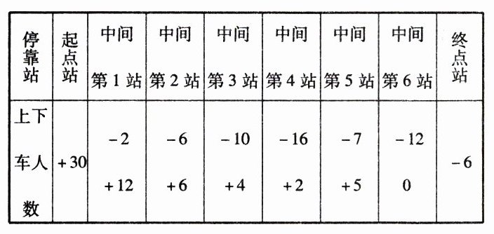 1. 一辆公共汽车从起点站开出后,途中经过6个停靠站,最后到达终点站。下表记录了这辆公共汽车全程载客数量的变化情况。