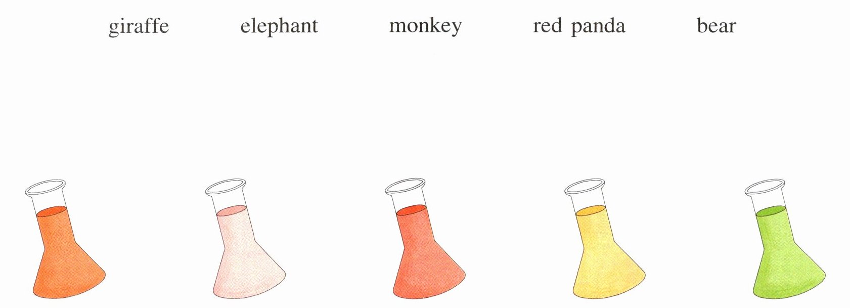 giraffe—粉色 elephant—黄色 monkey—绿色 red panda—橙红色 bear—红色