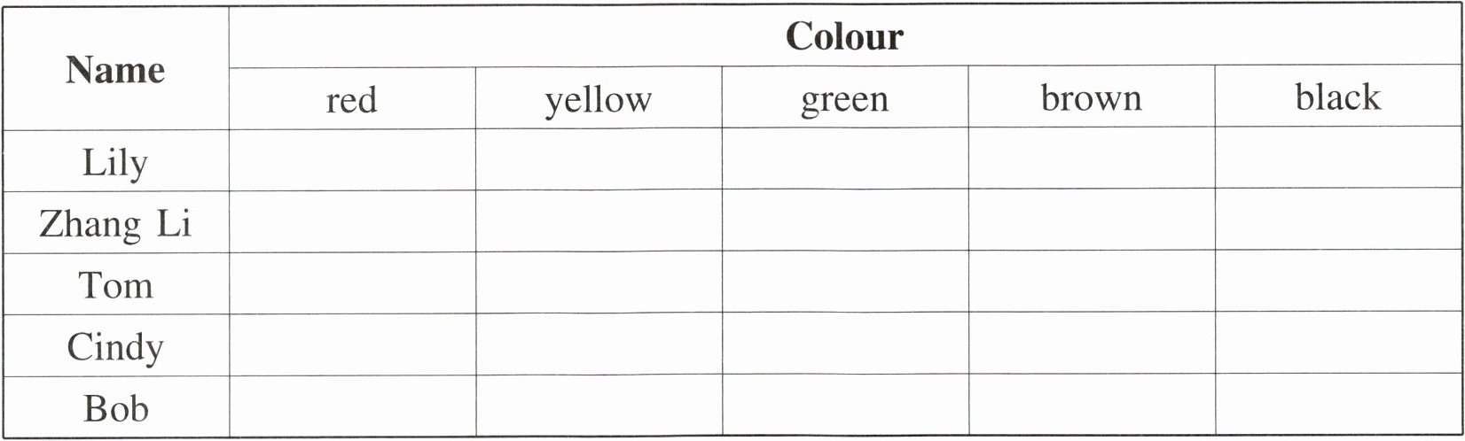 Lily—red Zhang Li—brown Tom—green Cindy—yellow Bob—black