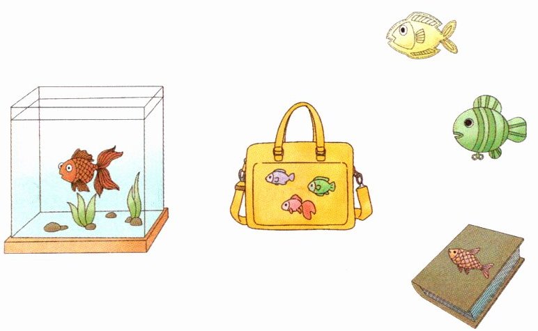 圈出关于鱼的棕色的书、绿色的玩具鱼和黄色的包。