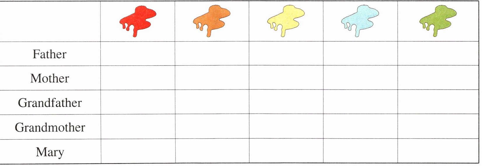 Father—蓝色 Mother—橙红色 Grandfather—红色、黄色 Grandmother—红色 Mary—绿色