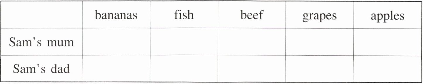 Sam's mum:√、√、√、×、√ Sam's dad:×、√、√、×、√