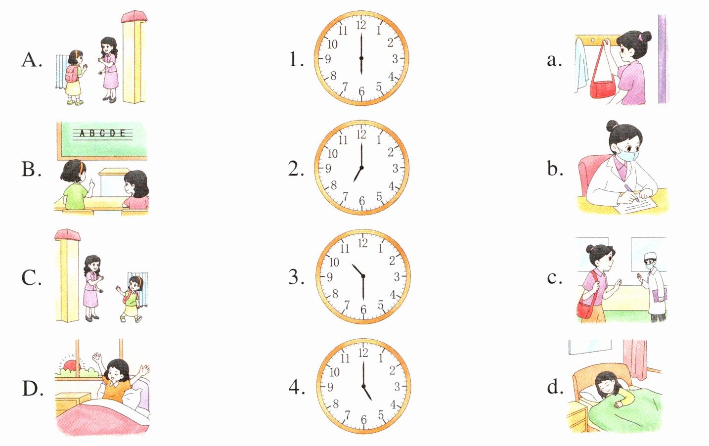 [新情境] Li Lin 的妈妈是一名医生,Li Lin 和妈妈经常有不同的作息。听录音,将时间和 Li Lin 及妈妈的活动连线。(听两遍)