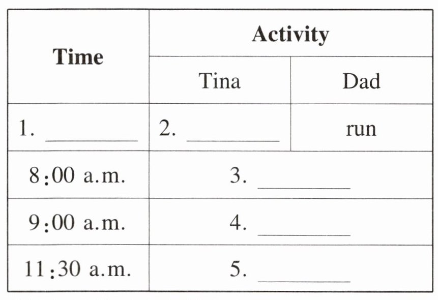 任务一:听第一遍录音,选择正确的时间或活动。完成爸爸和 Tina 的时间表。有一项多余。