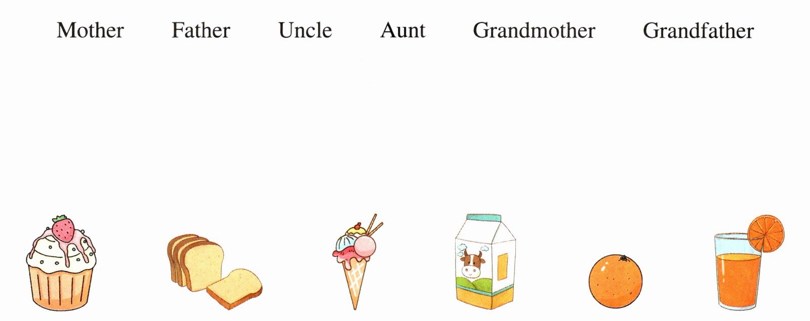 Mother—蛋糕 Father—面包 Uncle—冰激凌 Aunt—橙汁 Grandmother—橙子 Grandfather—牛奶