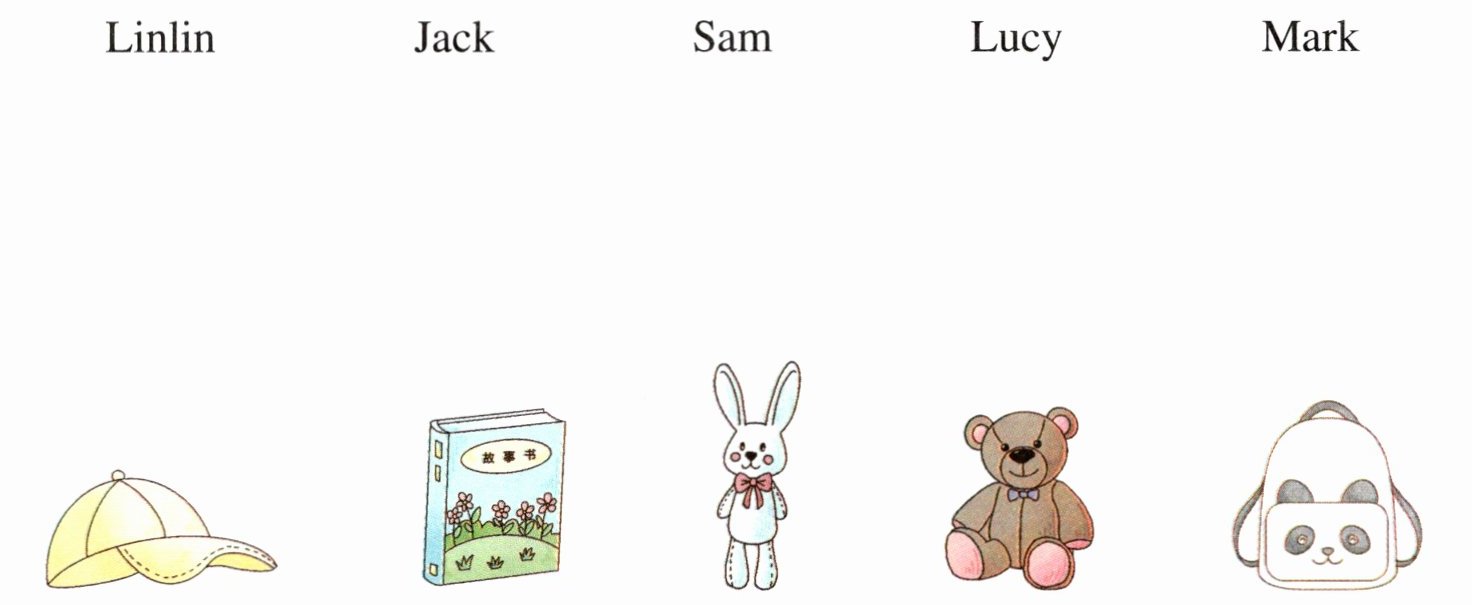 Linlin—玩具兔子 Jack—玩具熊 Sam—帽子 Lucy—书包 Mark—故事书