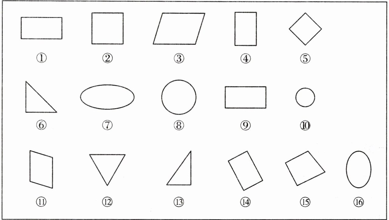 1.长方形:①④⑨⑭ 2.正方形:②⑤ 3.三角形:⑥⑫⑬ 4.圆:⑦⑧⑩⑯ 5.平行四边形:③⑪