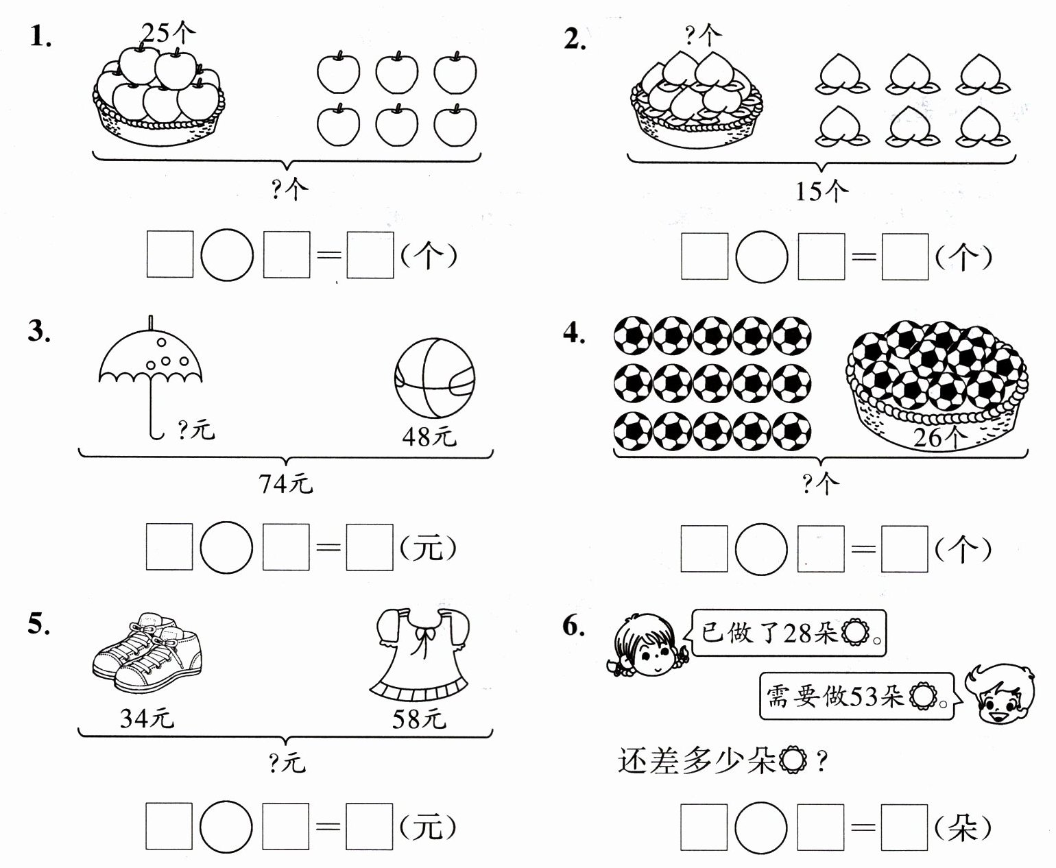 ①原来有多少个? ②还剩下多少个? ③又买来多少个? ④一共有多少个?