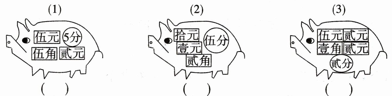 7. 算一算,哪个储蓄盒里的钱最多,在(