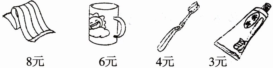 买杯子、毛巾、牙帽。$20 - 8 - 6 - 4 = 2$(元)