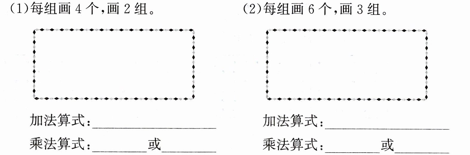 【解析】:$3 + 3 + 3 + 3 + 3 = 15$,可以理解为有$5$个$3$相加。第一种方阵可以排成$5$行$3$列,即每行有$3$个$◯$,一共有$5$行;第二种方阵可以排成$3$行$5$列,即每行有$5$个$◯$,一共有$3$行。