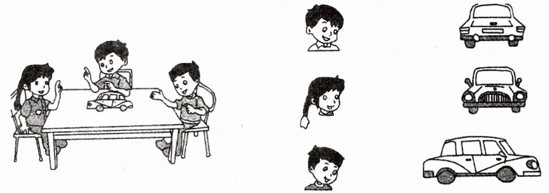 【答案】:扎辫子小女孩——汽车侧面图;中间小男孩——汽车尾部图;右边小男孩——汽车头部图。