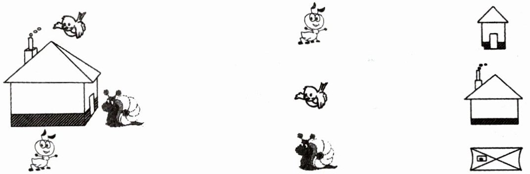 【答案】:小蚂蚁看到有门的房子图形,小鸟看到屋顶图形,蜗牛看到烟囱在侧面的房子图形。