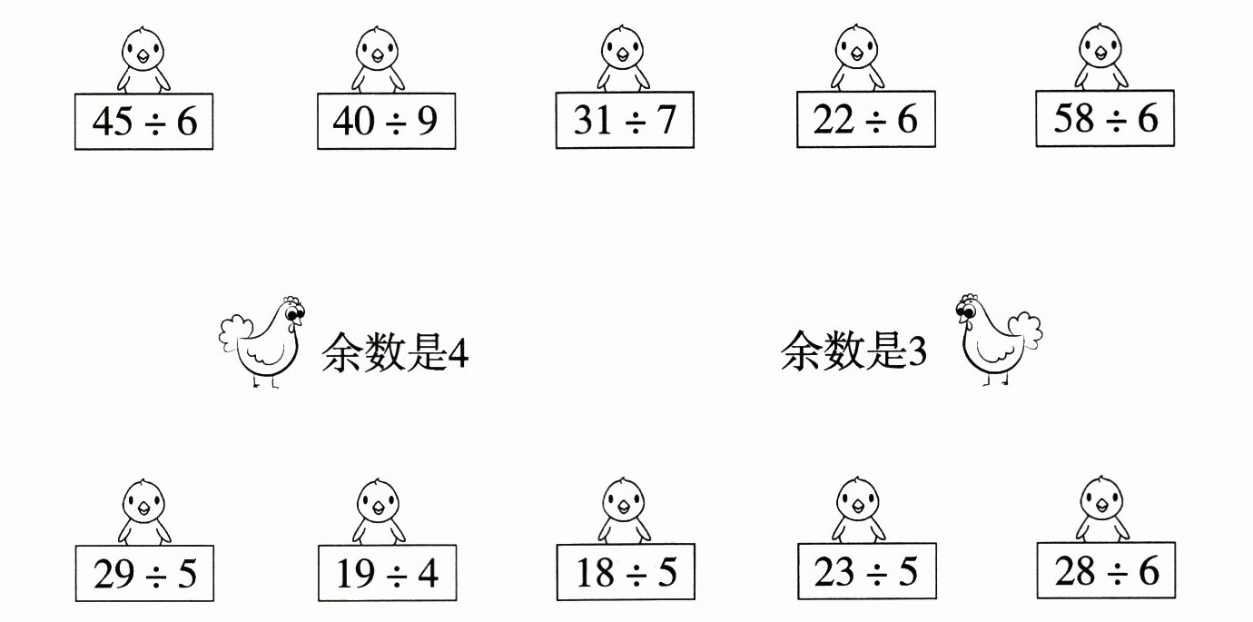 余数是 4 的:$40÷9$ $22÷6$ $58÷6$ $29÷5$ $28÷6$ 余数是 3 的:$45÷6$ $31÷7$ $19÷4$ $18÷5$ $23÷5$