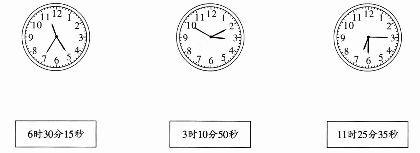 【解析】:根据钟表指针的位置判断时间,短针是时针,中长针是分针,最长针是秒针。第一个钟表时针在5 - 6之间靠近5,分针在11 - 12之间,秒针在7处,不是所给时间;第二个钟表时针在3 - 4之间靠近3,分针在10处,秒针在2处,对应3时10分50秒;第三个钟表时针在6 - 7之间靠近6,分针在3处,秒针在5 - 6之间靠近6,对应6时30分15秒。