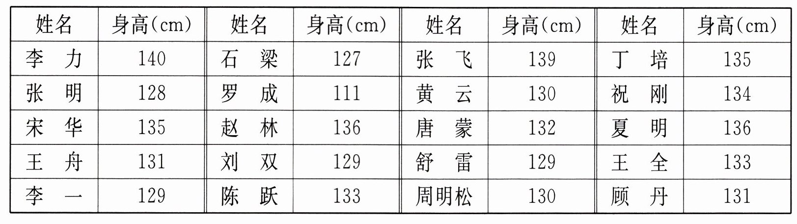 二(1)班男身高情况记录表