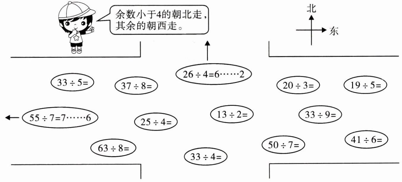 朝北走:$33÷5 = 6\cdots\cdots3$、$20÷3 = 6\cdots\cdots2$、$25÷4 = 6\cdots\cdots1$、$13÷2 = 6\cdots\cdots1$、$33÷4 = 8\cdots\cdots1$、$50÷7 = 7\cdots\cdots1$;