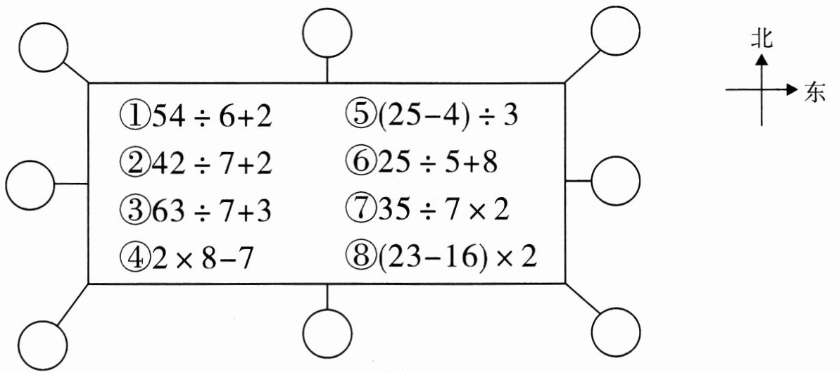 三、根据算式的结果,将算式的序号填在不同方向的圈里。