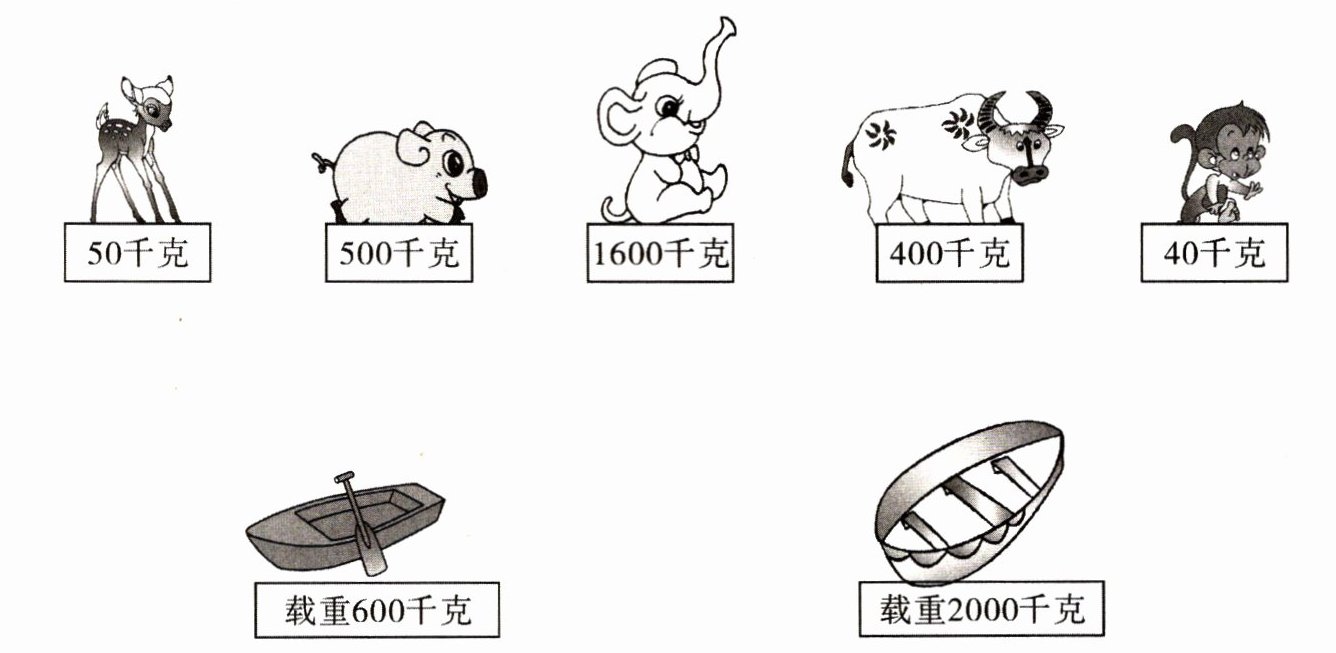 【解析】:先计算各动物体重组合。小鹿$50$千克、小猪$500$千克、小猴$40$千克,它们体重之和为$50 + 500 + 40 = 590$千克,$590\lt600$,可乘载重$600$千克的船;大象$1600$千克、牛$400$千克,它们体重之和为$1600 + 400 = 2000$千克,可乘载重$2000$千克的船。