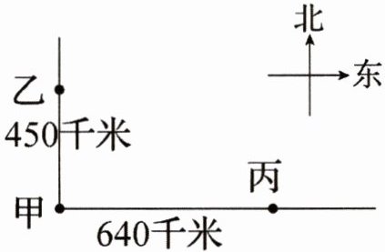 $35×19 = 665$(千米)$665 > 640$ 在丙地的东面。$665 - 640 = 25$(千米)