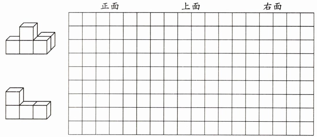 1. 下面的立体图形,从正面、上面和右面看到的形状分别是什么?画一画。