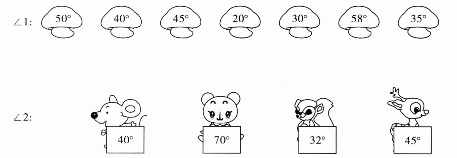 【答案】:$50^{\circ}$的$\angle1$与$40^{\circ}$的$\angle2$相连;$45^{\circ}$的$\angle1$与$45^{\circ}$的$\angle2$相连;$20^{\circ}$的$\angle1$与$70^{\circ}$的$\angle2$相连;$58^{\circ}$的$\angle1$与$32^{\circ}$的$\angle2$相连。