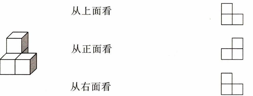 【解析】:从上面看,看到的图形应该是底层两个正方形横向排列,左上角还有一个正方形,对应第三幅图;从正面看,看到的图形应该是底层两个正方形横向排列,右上角还有一个正方形,对应第二幅图;从右面看,看到的图形应该是底层两个正方形横向排列,左上角还有一个正方形,对应第一幅图。